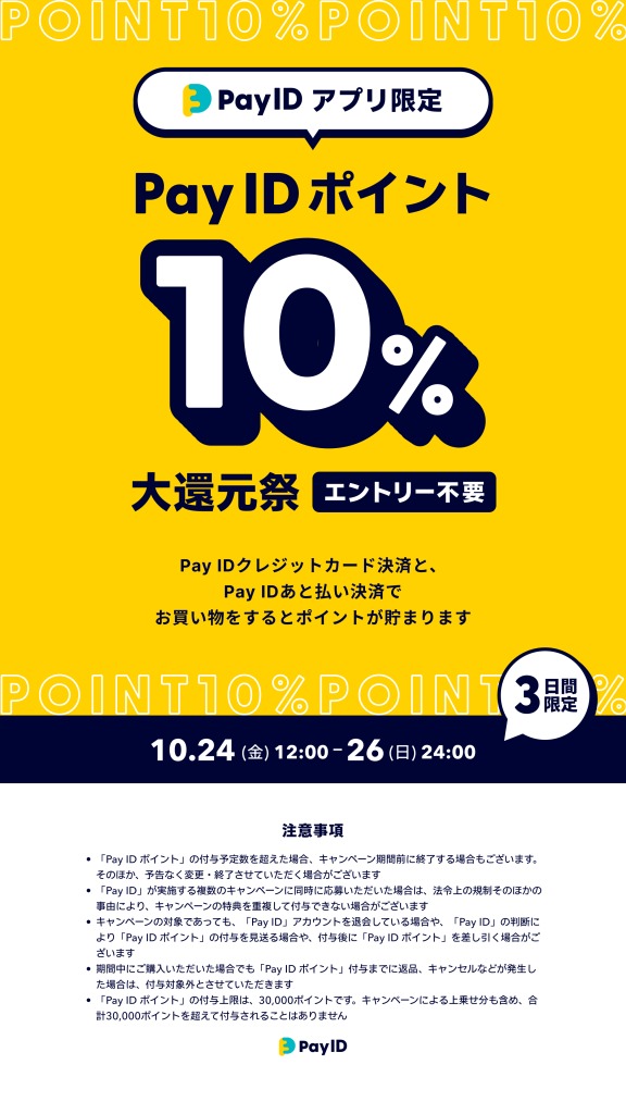 【10/24〜26】「Pay IDアプリ」限定「Pay ID ポイント」10%大還元祭!