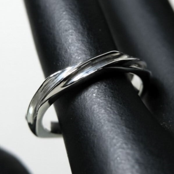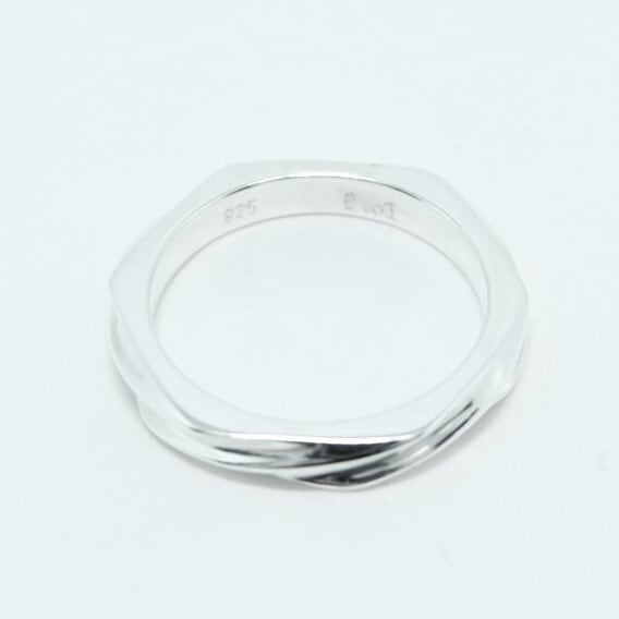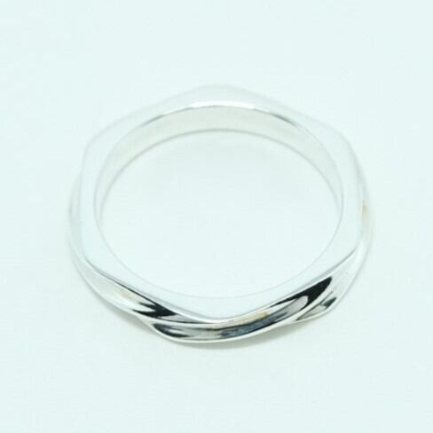 表と裏の六角形がねじれたがデザインが特徴のリング。