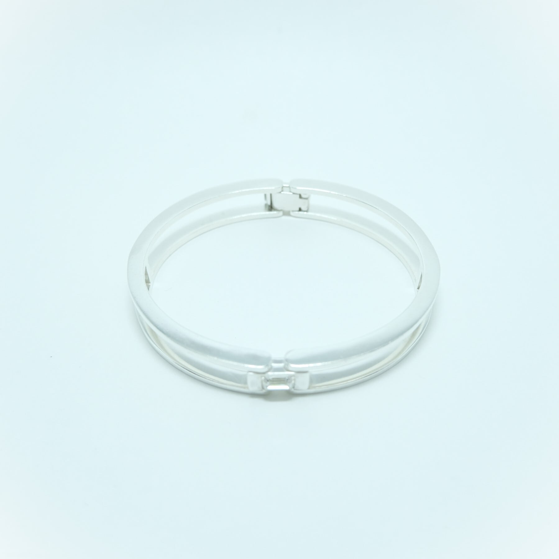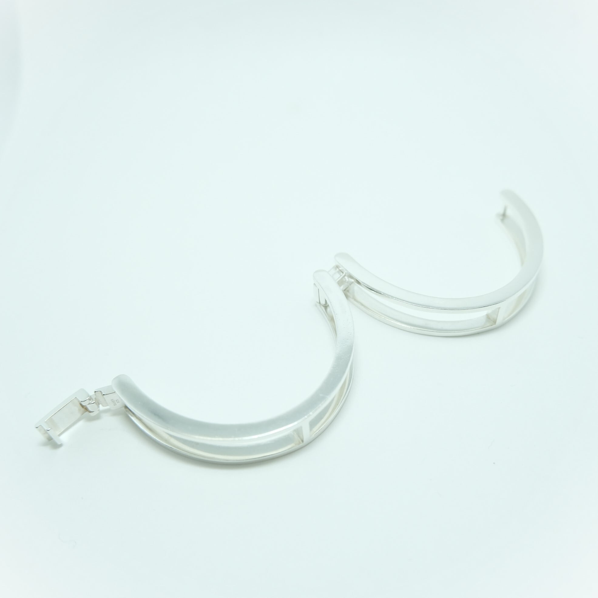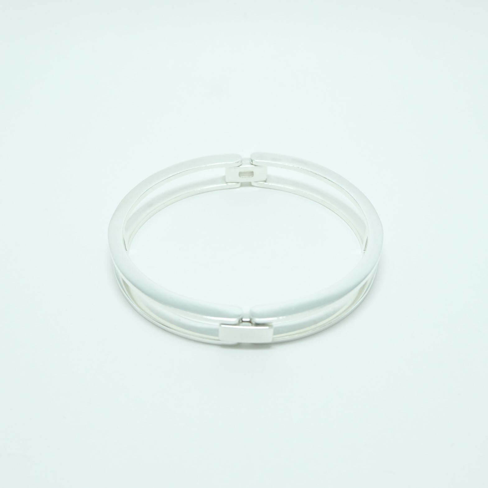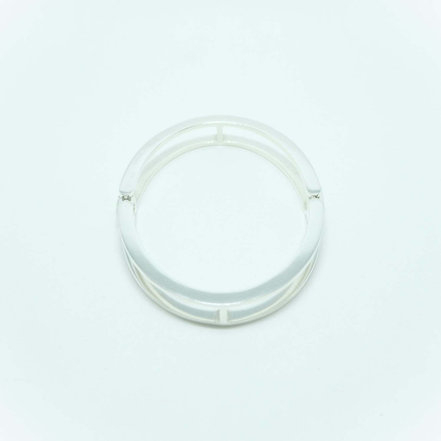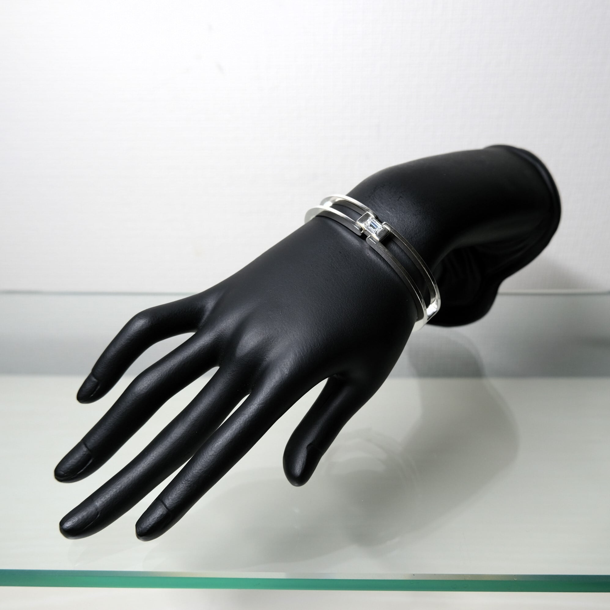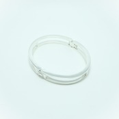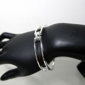 手錠の様なユニークなデザインが目を引くカフブレスレットは、開閉式で着脱が簡単。