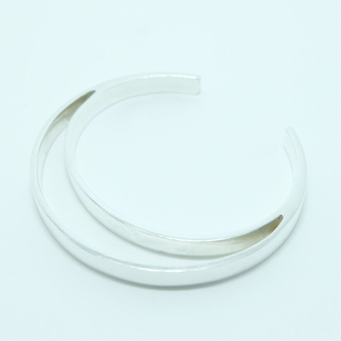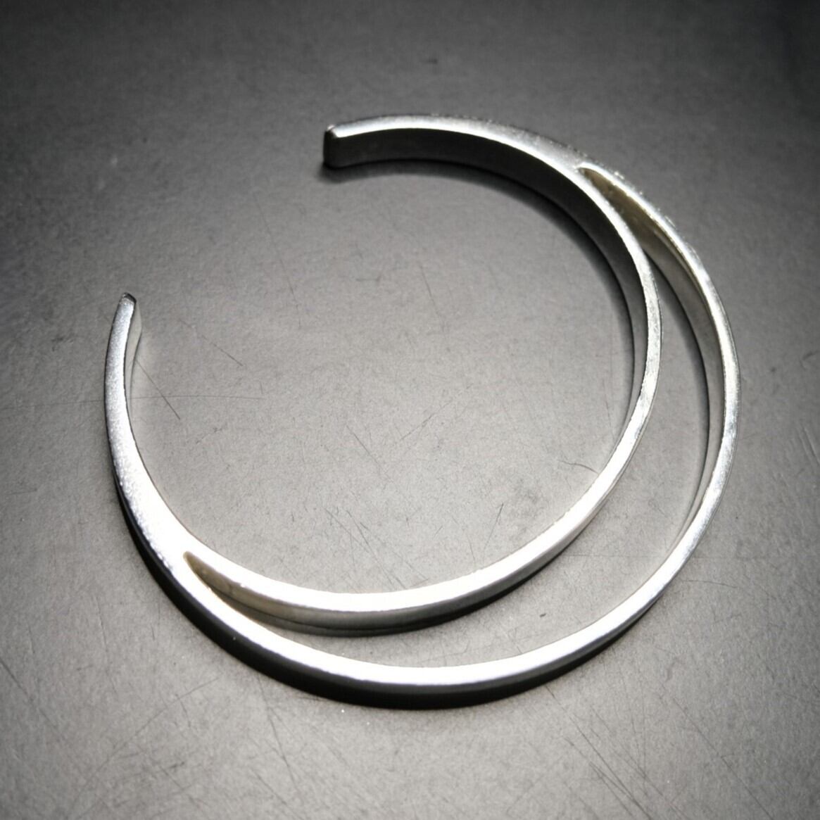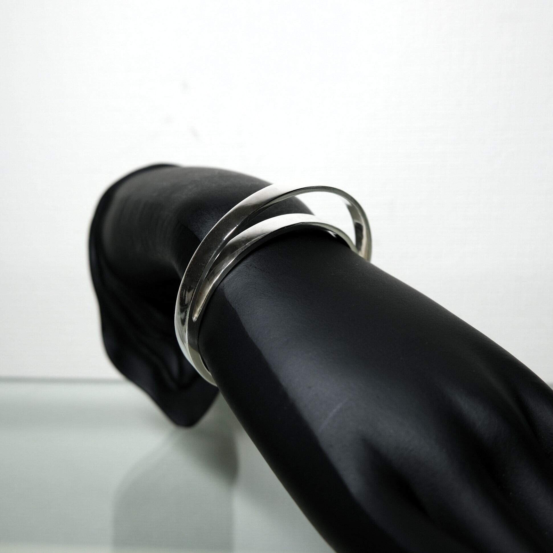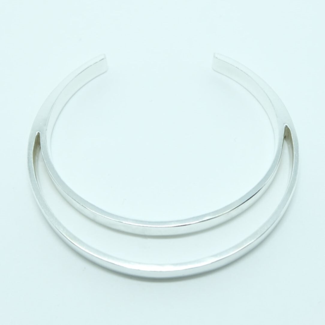二つのバングルが重ね着けされたかのような独特なデザインが特徴のバングル。