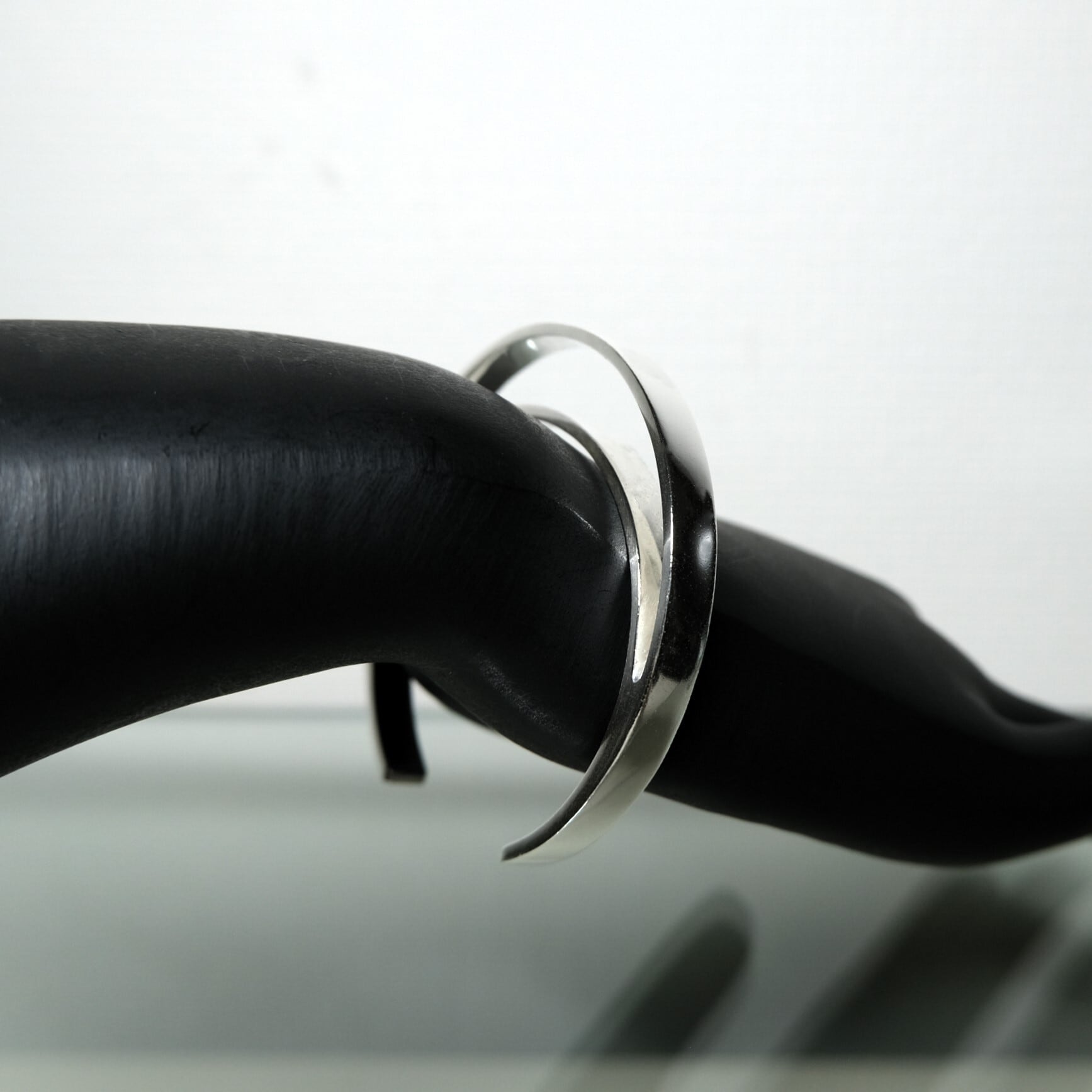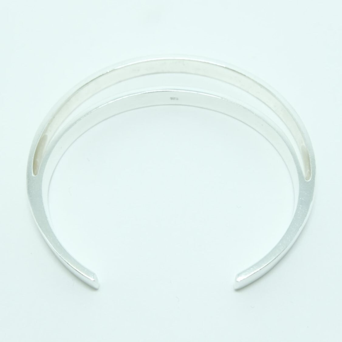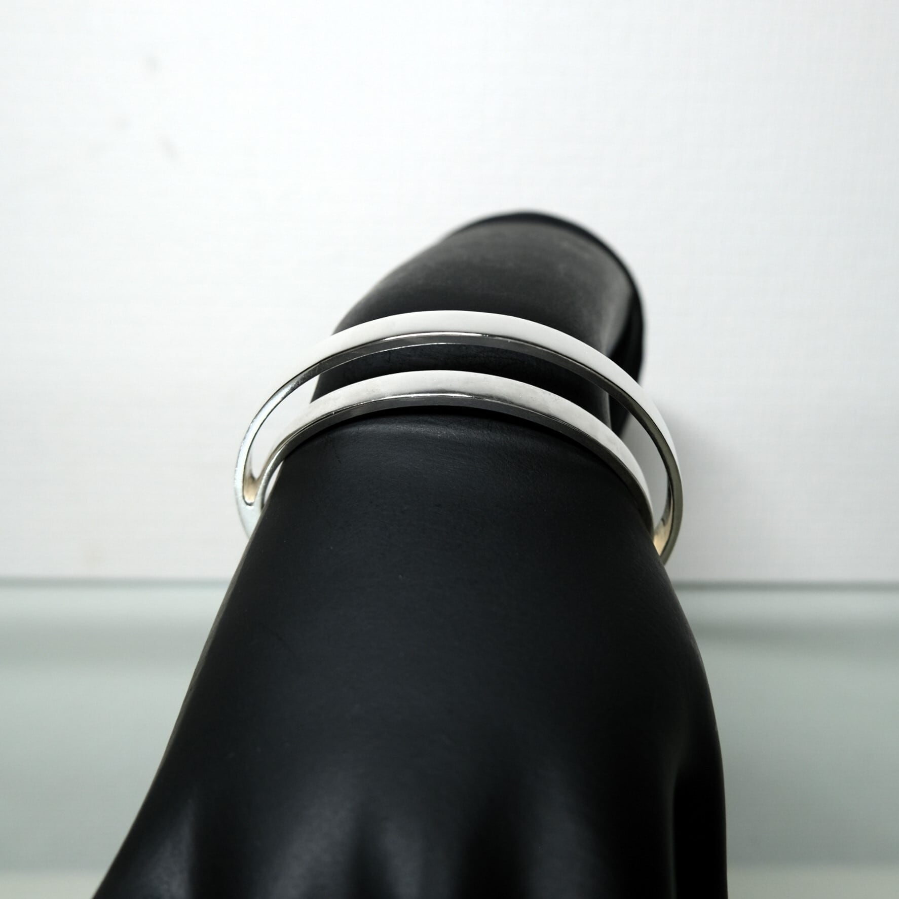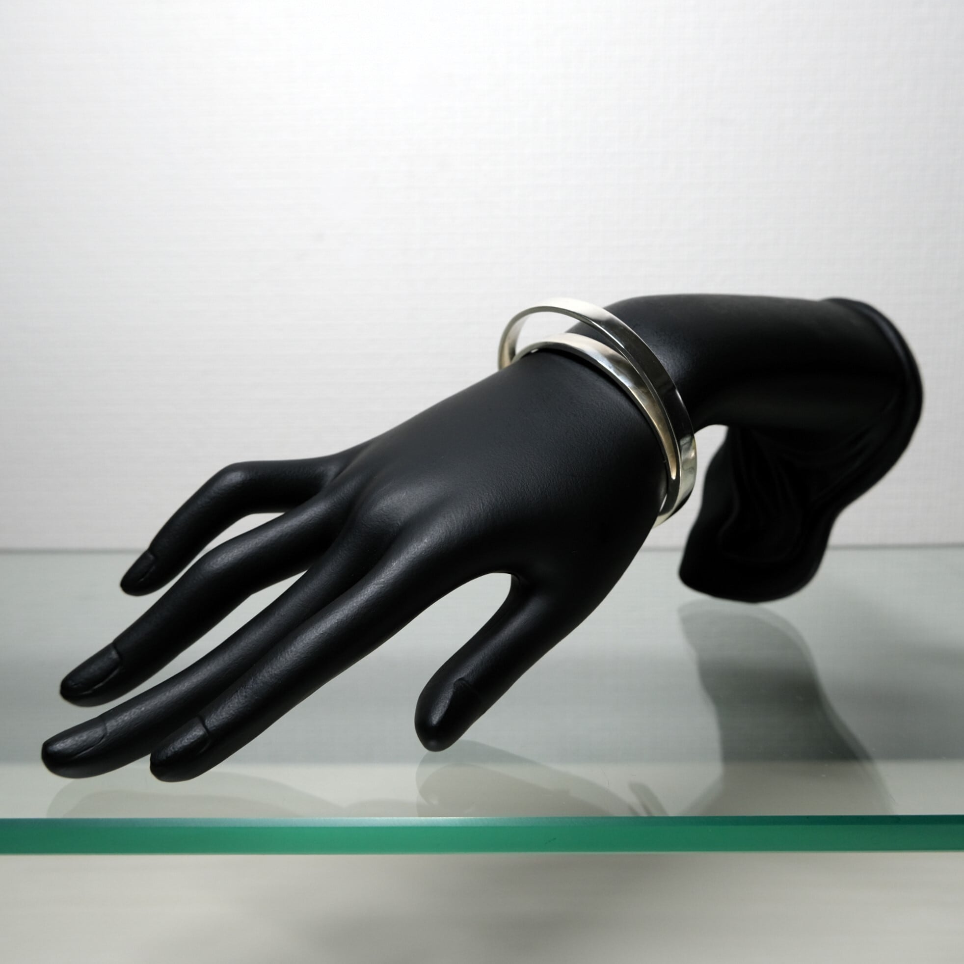 二つのバングルが重ね着けされたかのような独特なデザインが特徴のバングル。