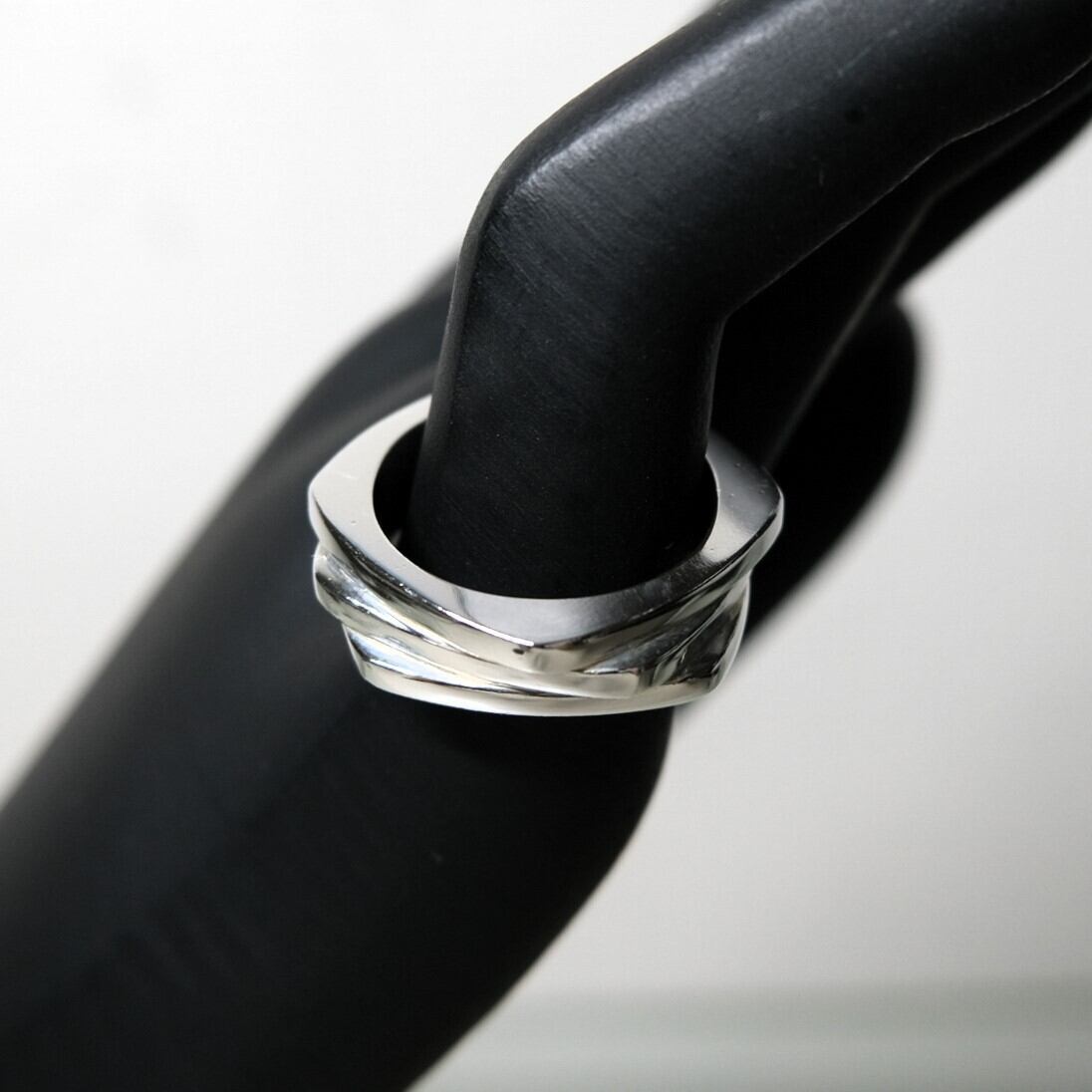 ユニークなデザインの四角いリングが3つ重なった、シンプルでありながら個性的な印象を与えるスタックリング。